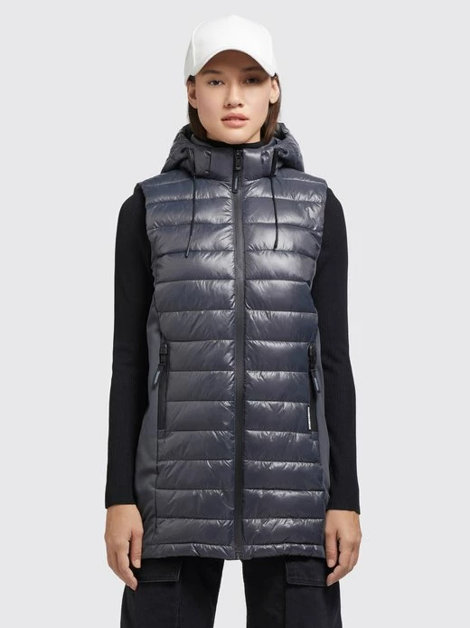 Die glänzende khujo Weste BECCA SHINY mit abnehmbarer Kapuze und einem elastischen Kordelzug sowie einer leichten Wattierung in der gesteppten Vorderseite, Kapuze und dem Rückenteil lässt sich vielseitig kombinieren. Dank einem Reißverschluss und seitlichen Reißverschlusstaschen mit einer wasserabweisenden Beschichtung, einer Windschutzblende und einem verstärkten Stehkragen bist Du mit dieser Steppweste gut ausgestattet.
